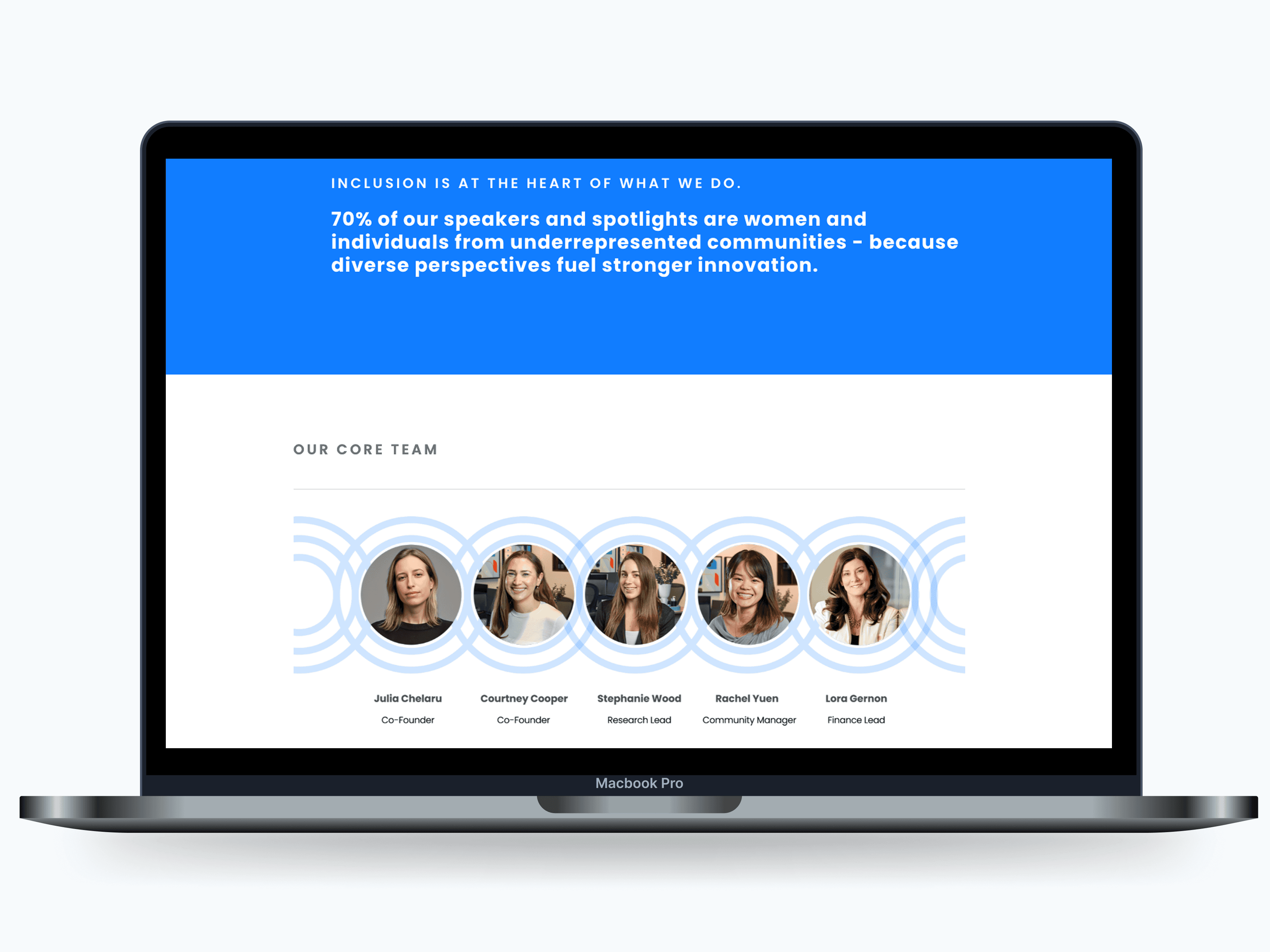 At the bottom of the page, I added a team spotlight using the circular photo pattern from the homepage to maintain visual cohesion. This section highlighted the founding team and our client, reinforcing Proptech Collective’s community-driven identity.